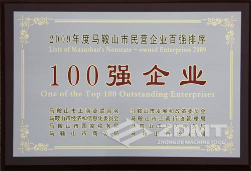 由市工商联,市发改委,经信委,工商局,国税局,地税局,商务局,统计局共同组织开展的马鞍山市2009年度民营企业百强排序活动揭晓,中德机床公司榜上有名,分列“2009年度马鞍山市民营企业营业收入100强”第70位,“2009年度马鞍山市民营企业纳税总额100强”第87位, 2009年马鞍山市民营企业面临国际金融危机等环境影响,在市委 樱花视频网站,市政府一系列及时的,有效的政策引导扶持下,民营经济活力进一步显现,民营企业成为推动全市经济增长的重要力量,此次民营企业百强排序活动呈现出:入围门槛不断提高,营业收入总量加速增长,纳税总额大幅提升,质量稳步提升等特点。